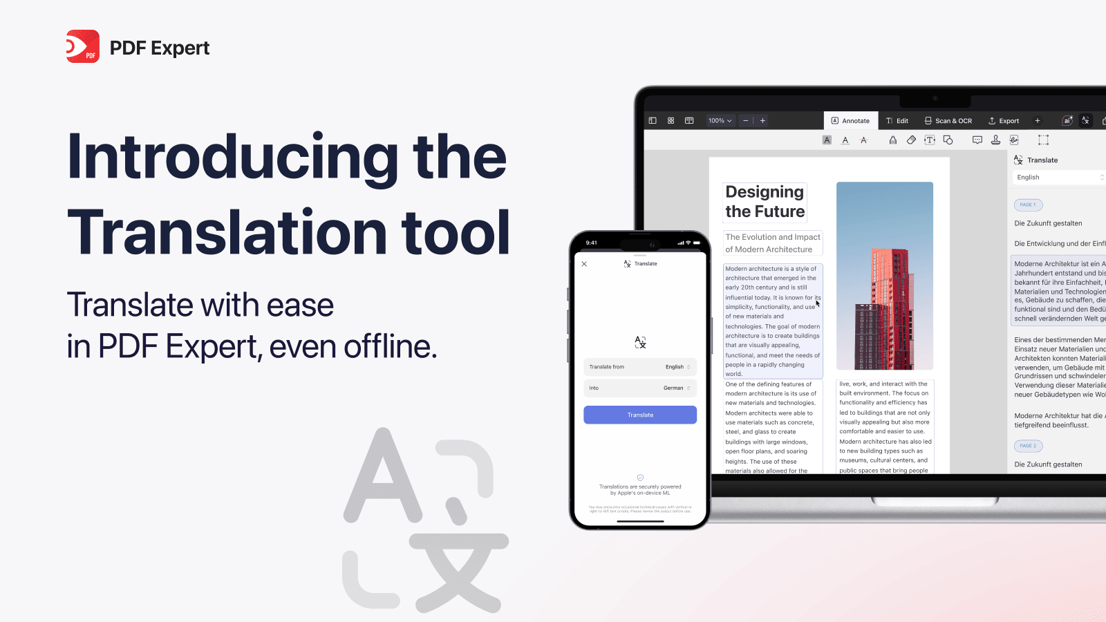 Introducing the Translation tool — a secure way to translate entire PDFs offline, right inside PDF Expert. No copying, no pasting, no app-switching required.