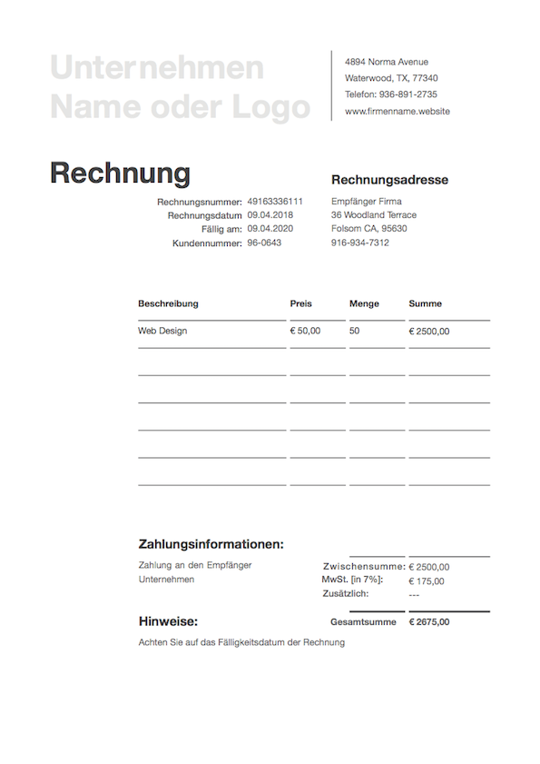 Werfen wir einen Blick auf die verschiedenen Arten von Rechnungen und erfahren, wie man eine Rechnung erstellen. Sie können unsere kostenlose Rechnung-Vorlagen im Nachfolgenden herunterladen und sie für Ihr eigenes Unternehmen nutzen oder Ihre eigene Rechnung mit Bezug auf diese Rechnung-Vorlagen erstellen.