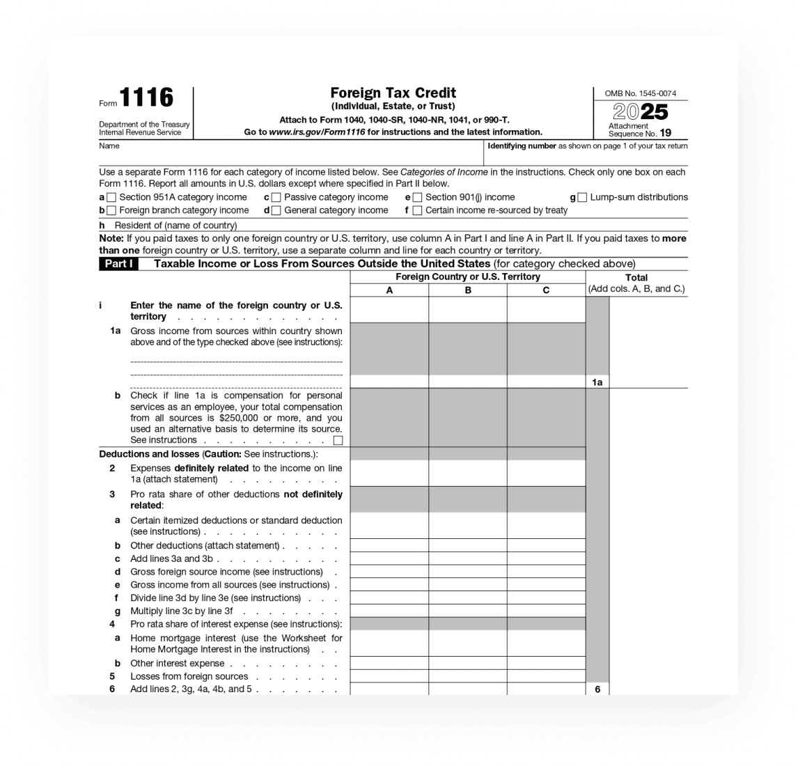 El formulario 1116 del IRS, Crédito fiscal extranjero, lo utilizan los contribuyentes para reclamar un crédito por los impuestos pagados o devengados a un país extranjero o una posesión en EE.UU. Este formulario está diseñado para evitar la doble imposición, permitiendo a los contribuyentes de EE.UU. deducir la obligación tributaria sobre las rentas que ya estaban gravadas por una jurisdicción extranjera. El formulario es aplicable a personas físicas, sucesiones y fideicomisos que tengan ingresos en el extranjero y hayan pagado impuestos sobre esos ingresos a un gobierno extranjero.
