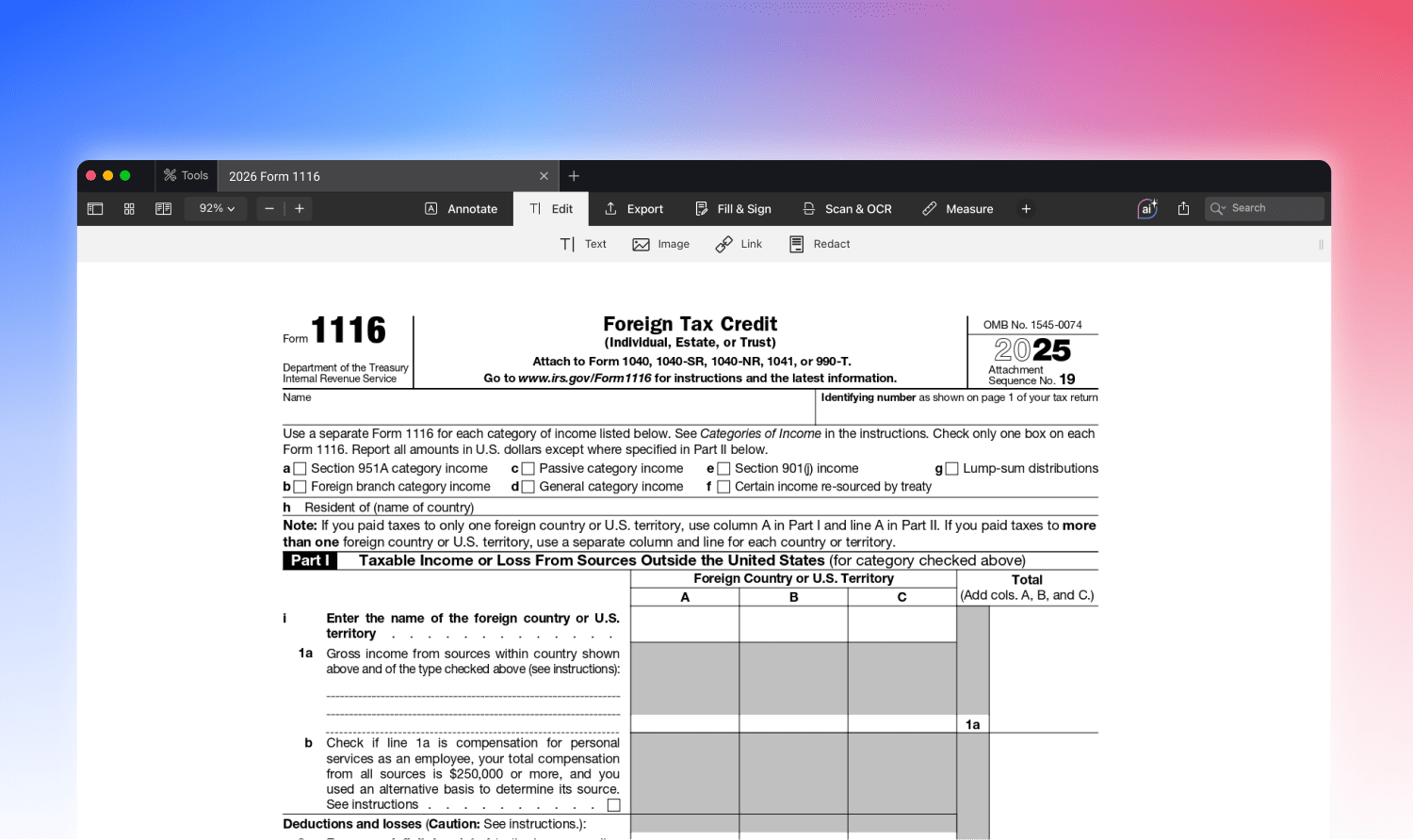 Utilizando PDF Expert, los contribuyentes pueden cumplimentar el Formulario 1116 de forma eficaz y precisa, garantizando el cumplimiento de los requisitos del IRS y maximizando su crédito fiscal extranjero admisible.