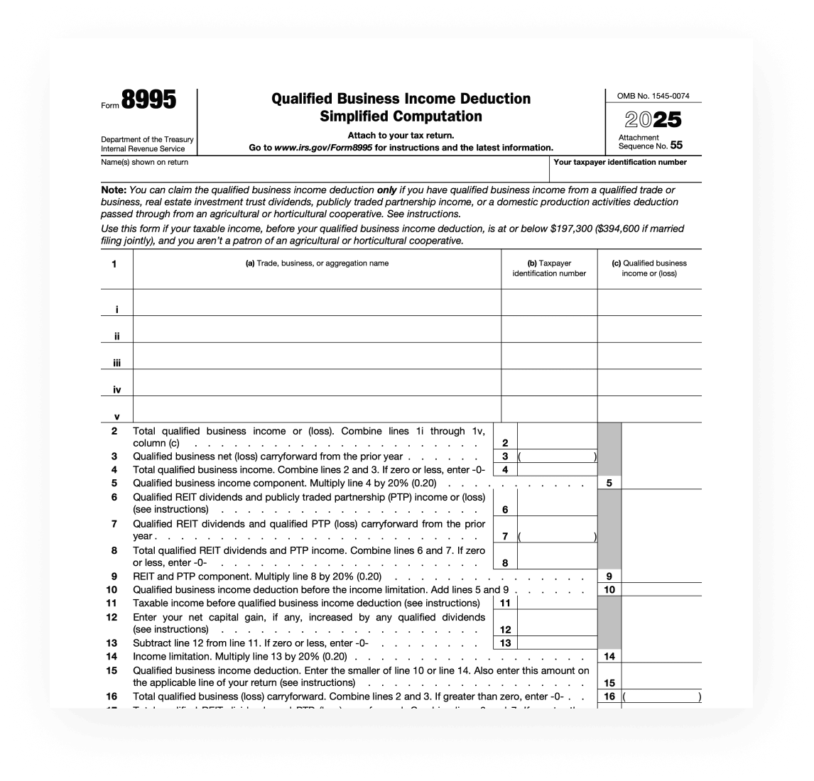 If your business is a sole proprietorship, partnership, limited liability company (LLC), or S corporation, you may qualify for a business income deduction. Form 8995 is required for taxpayers with a taxable income below a certain threshold ($197,300 for single filers and $394,600 for joint filers in 2025), simplifying their QBI deduction calculations. Those with higher incomes or more complex situations may need to use Form 8995-A.