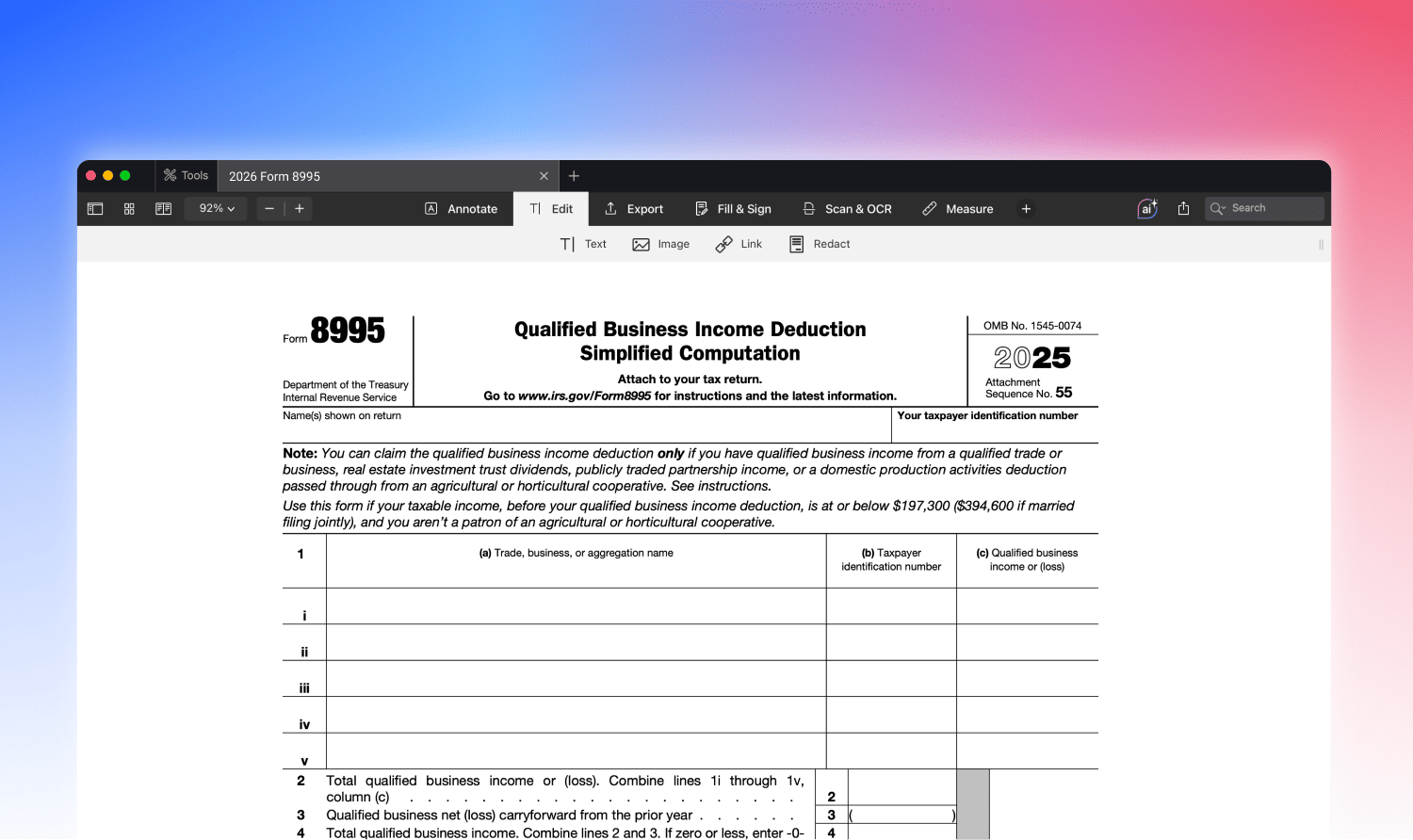 By utilizing PDF Expert, Mac users can efficiently and accurately complete Form 8995, ensuring that they meet IRS requirements and avoiding common errors.