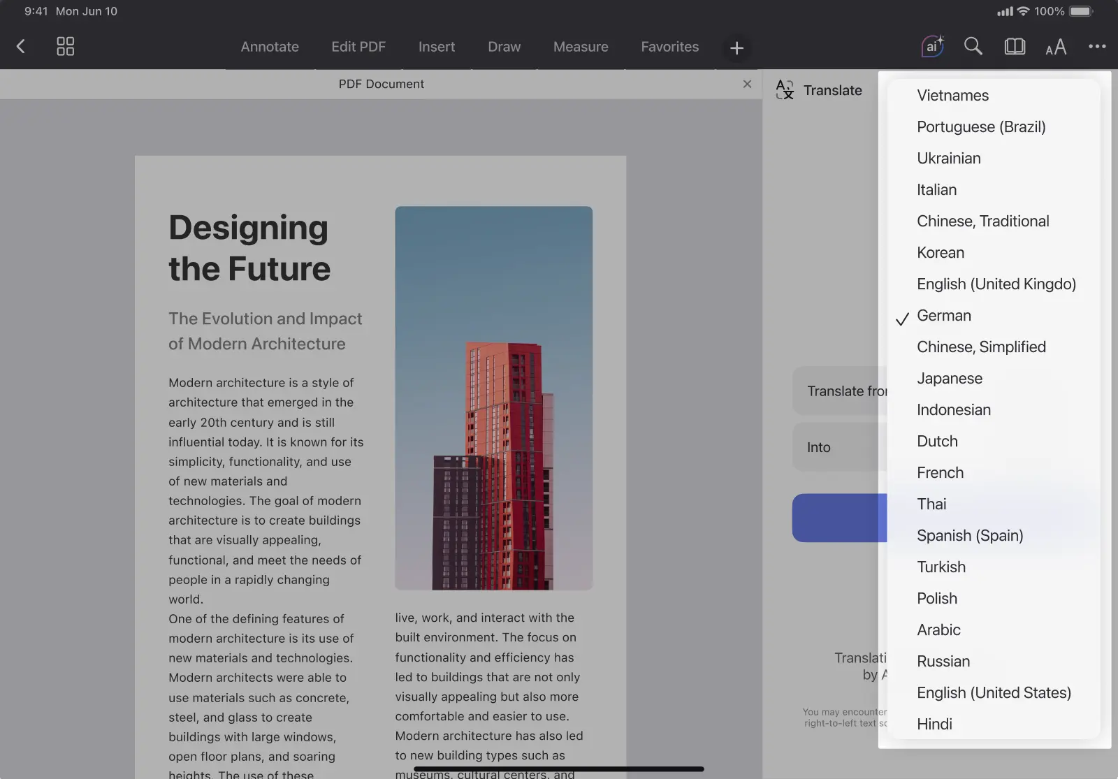 Working with PDFs in different languages is now effortless with PDF Expert. The Translation tool is designed to instantly translate complete PDFs into your desired language, even when you're offline. This is invaluable whether you're a student engaging with global research, a professional analyzing documents from other countries, or just reading content written in a non-native language. The Translation Tool is included with the PDF Expert Premium subscription. New users can explore it as part of the 7-day free trial.