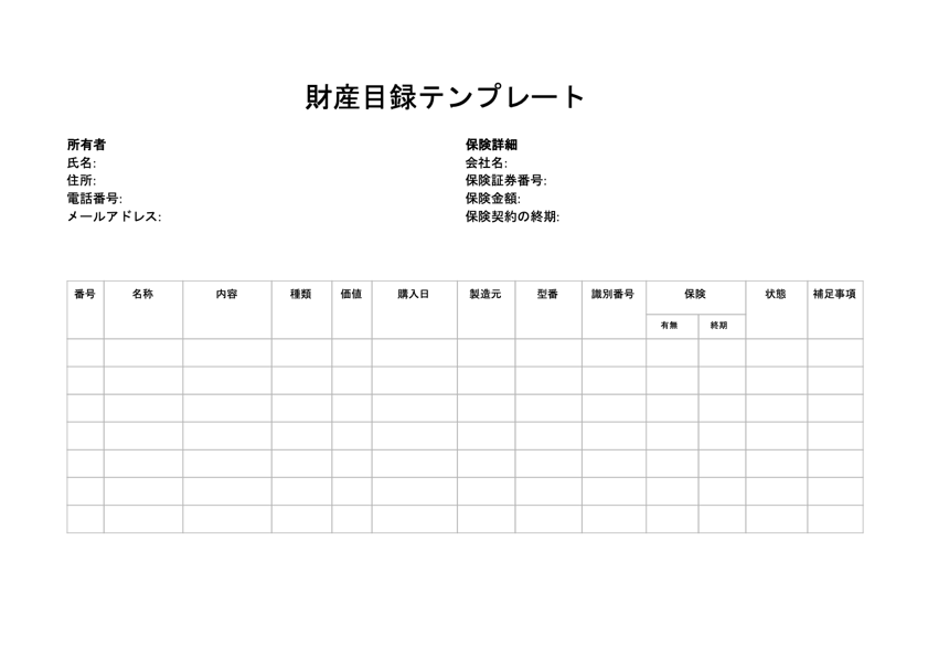 その名前の通り、財産目録のテンプレートは自身のすべての所持品の記録・管理するために役立ちます。このシンプルなテンプレートを使用することによって、あなたが所有しているアイテムを正しく分類して、その状態や価値などの概要リストを作成することができます。財産目録は数年に一度のペースで作成することをおすすめします。