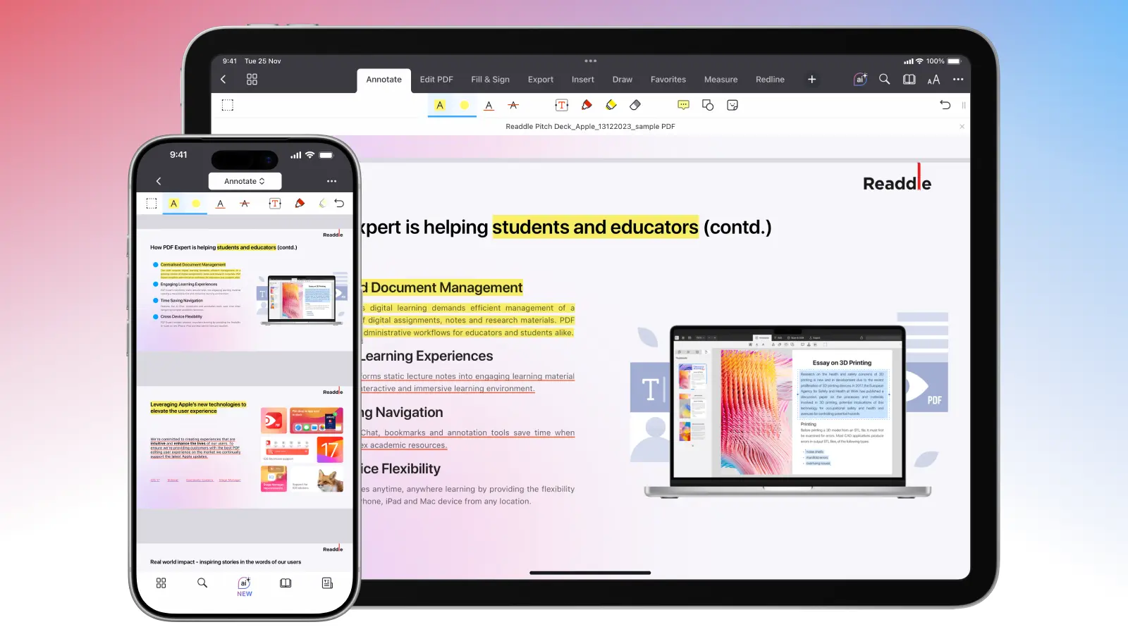 Em dispositivos móveis, a experiência é igualmente fluida. O PDF Expert oferece suporte total ao Apple Pencil no iPad para uma escrita manual mais natural. Para destacar um PDF no seu iPhone ou iPad: