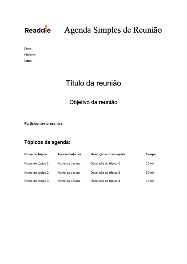 Segue abaixo um exemplo de um Modelo de Agenda de Reunião Simples. Você pode baixar este modelo de agenda de reunião gratuito e editar da maneira que precisar usando o PDF Expert, o melhor editor de PDF para iOS e Mac. Baixe o PDF Expert de graça para começar a usar este modelo de agenda de reuniões simples.