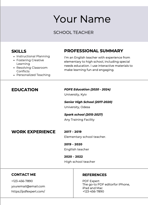 Every language and education resume will be unique, reflecting your individual experiences and strengths. Download and customize our free Resume Template for Language and Education using PDF Expert — the best PDF Editor for iPhone, iPad and Mac. Download PDF Expert for Free to get started with this free lesson plan template.