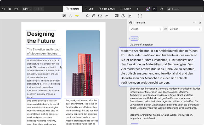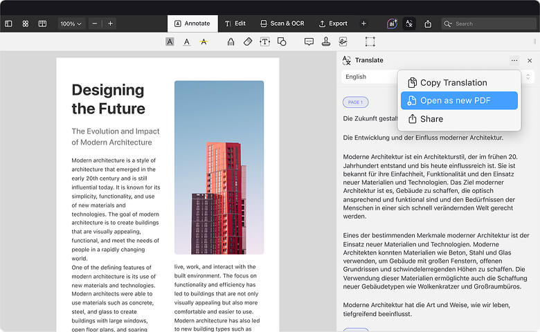 Зберігайте переклад як новий PDF-файл або продовжуйте роботу – додавайте зображення, налаштовуйте форматування, редагуйте текст, додавайте коментарі чи використовуйте PDF Copilot для швидкого аналізу.