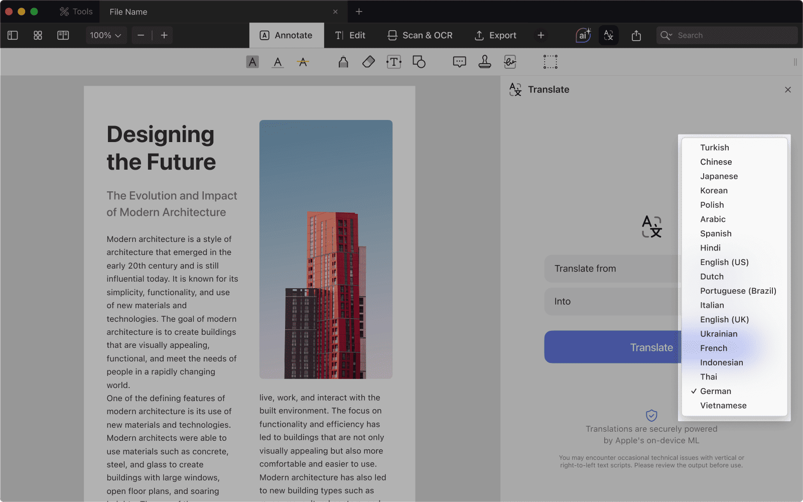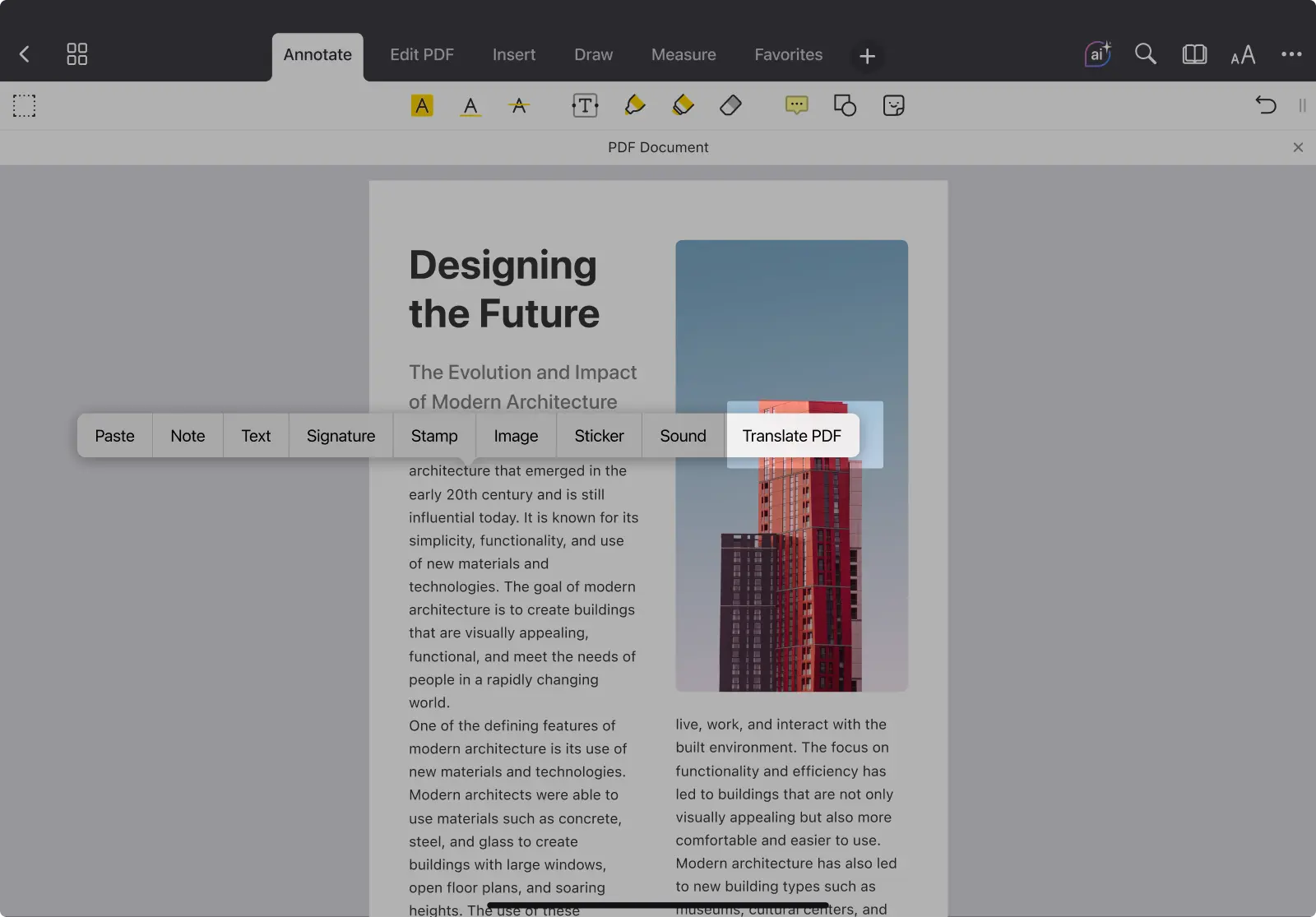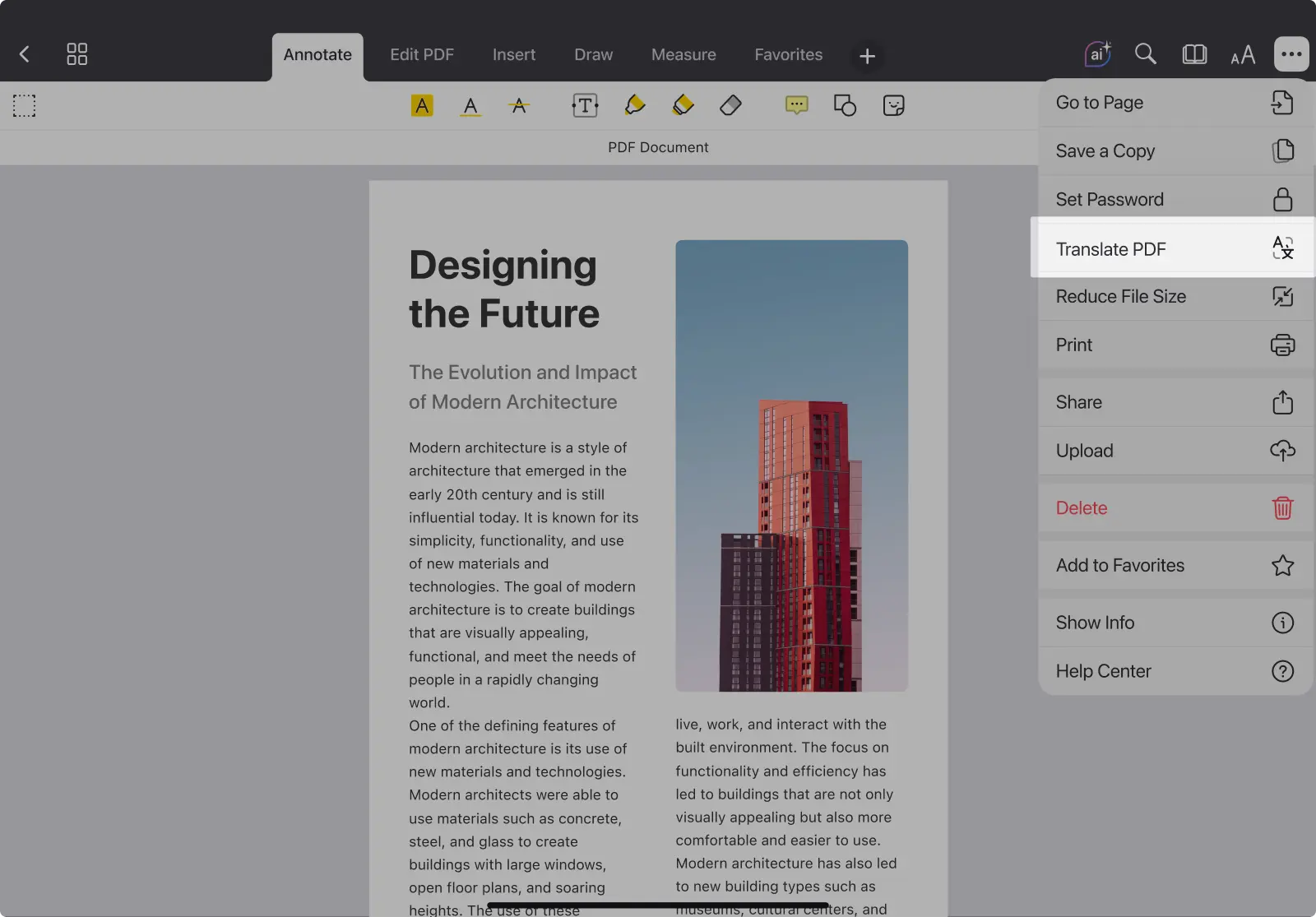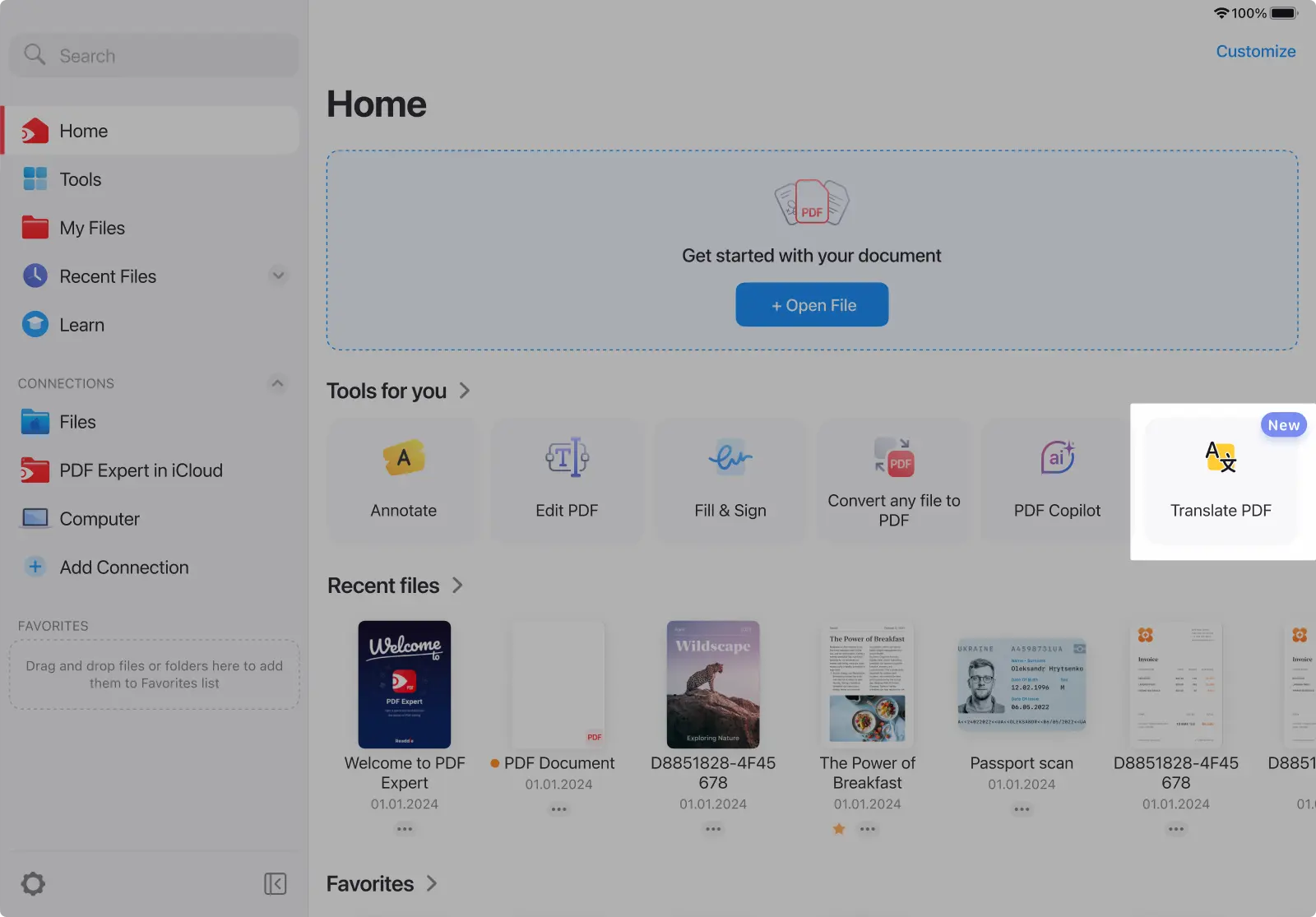 Працювати з PDF різними мовами тепер надзвичайно просто з PDF Expert. Інструмент перекладу створено для миттєвого перекладу цілих PDF-файлів обраною вами мовою, навіть офлайн. Це особливо корисно, якщо ви студент, який працює з міжнародними дослідженнями, фахівець, що аналізує документи з інших країн, або просто читаєте матеріали іноземною мовою. Інструмент перекладу входить до передплати PDF Expert Premium. Нові користувачі можуть спробувати його в межах 7-денної безплатної пробної версії.