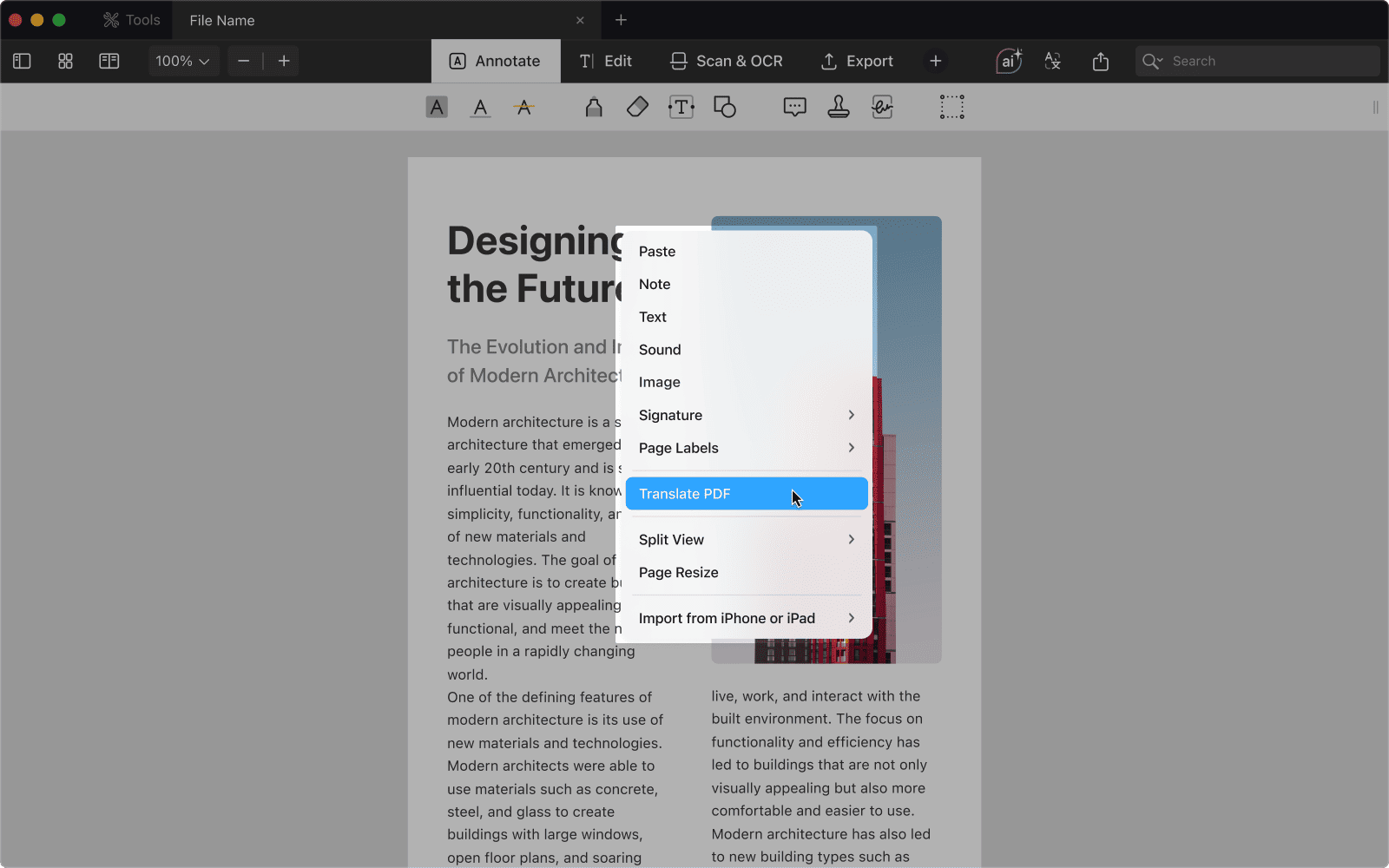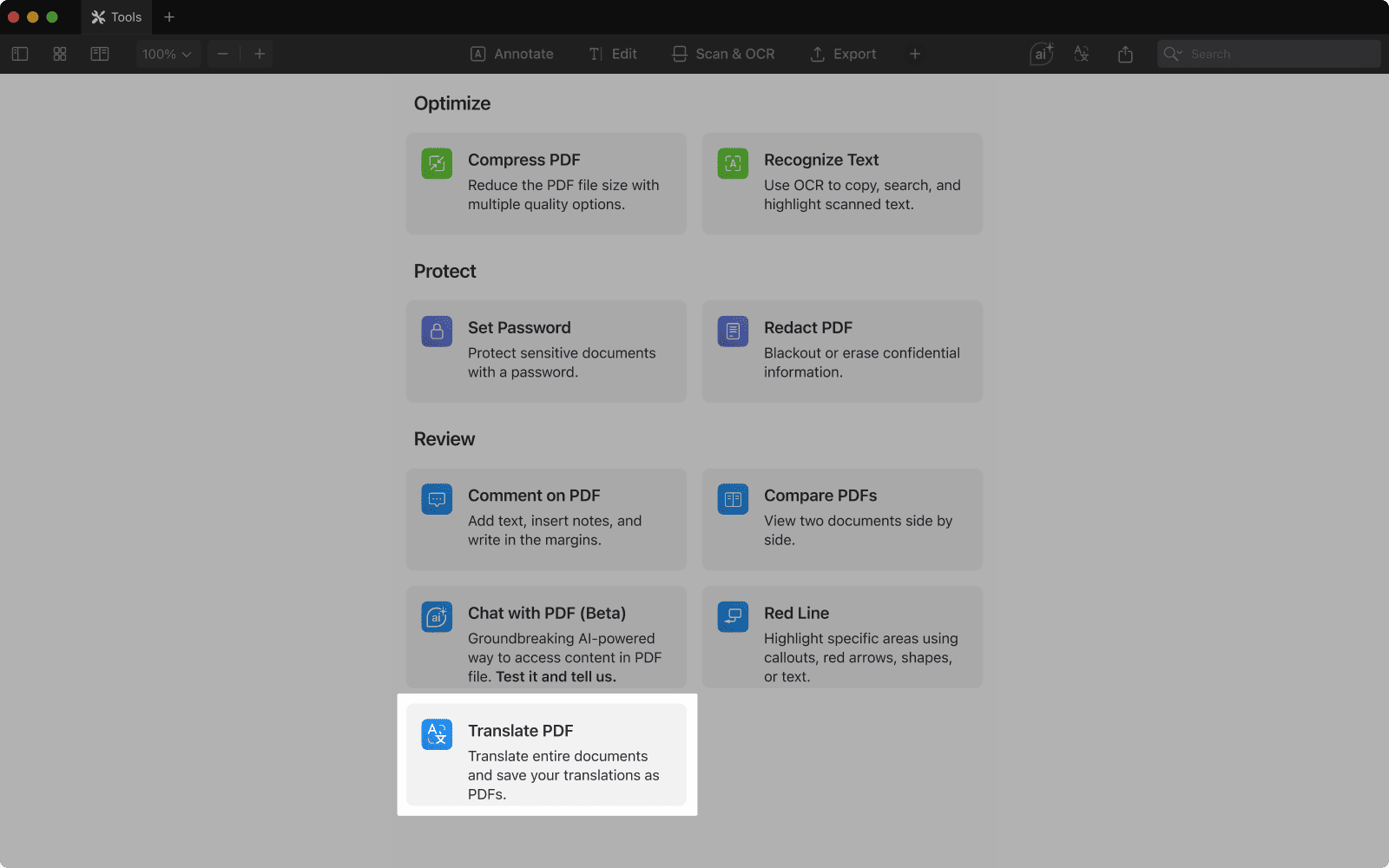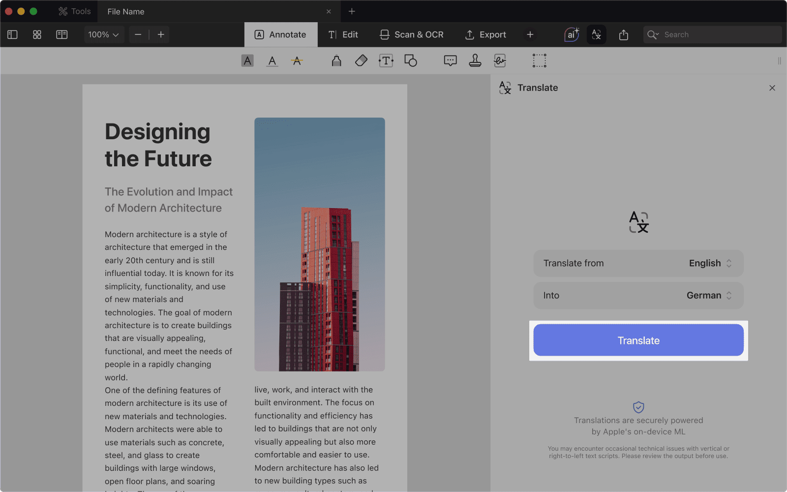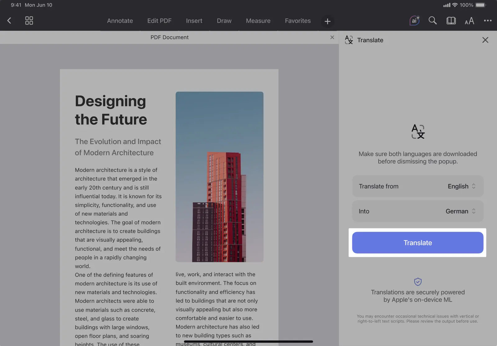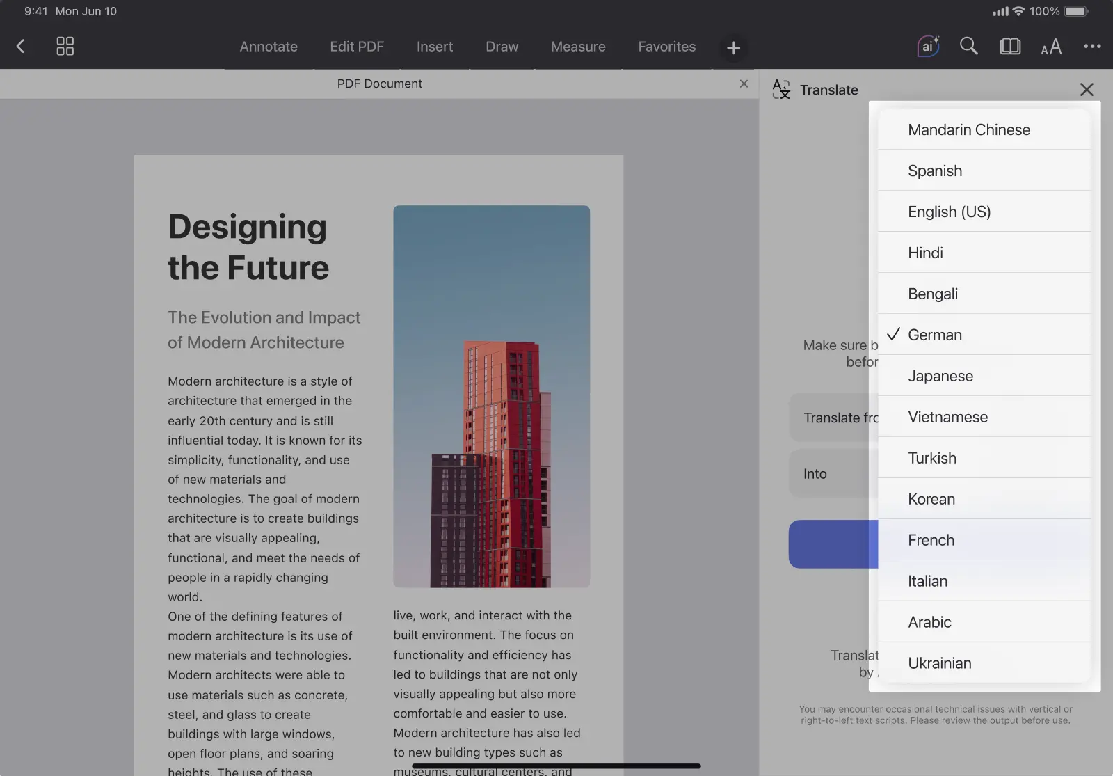 Працювати з PDF різними мовами тепер надзвичайно просто з PDF Expert. Інструмент перекладу створено для миттєвого перекладу цілих PDF-файлів обраною вами мовою, навіть офлайн. Це особливо корисно, якщо ви студент, який працює з міжнародними дослідженнями, фахівець, що аналізує документи з інших країн, або просто читаєте матеріали іноземною мовою. Інструмент перекладу входить до передплати PDF Expert Premium. Нові користувачі можуть спробувати його в межах 7-денної безплатної пробної версії.